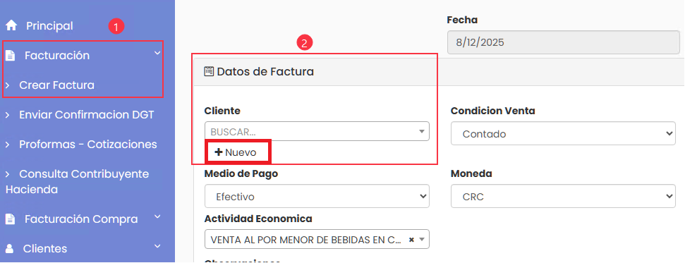 En la sección Datos de Factura, haz clic en +Nuevo para agregar un cliente si no está registrado.