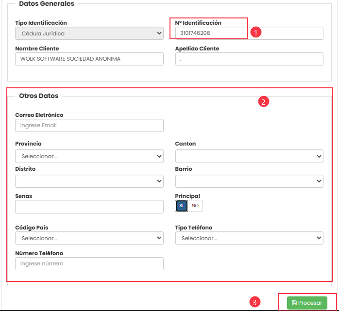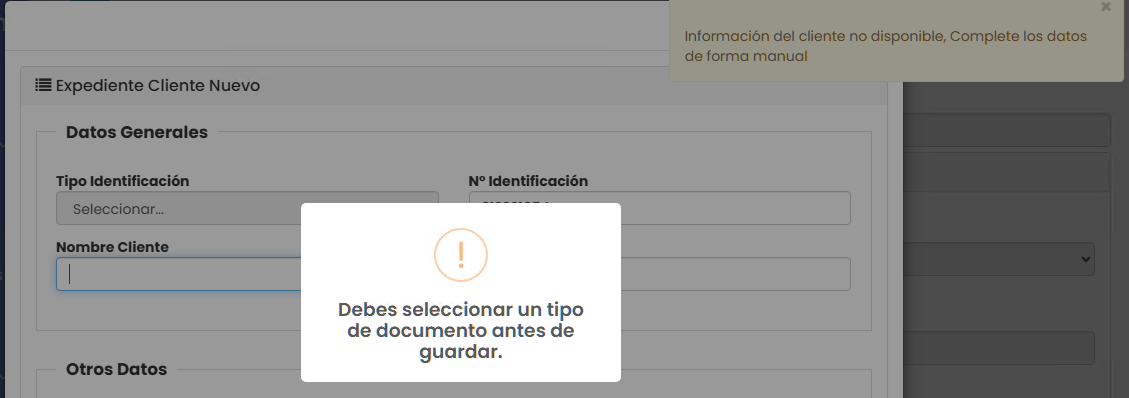 1. En la ventana Expediente Cliente Nuevo, digita el Número de Identificación y da clic en un campo aparte, el sistema cargará los datos generales automáticamente.