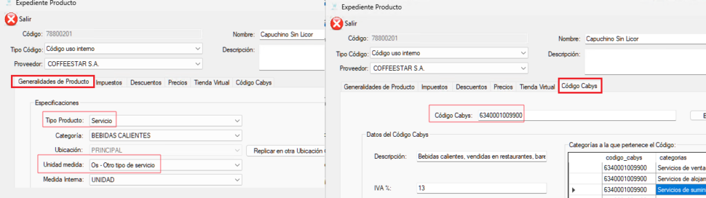 En cambio, si el “Tipo Producto” es Servicio, el código Cabys debe iniciar con los números 5, 6, 7, 8 o 9.