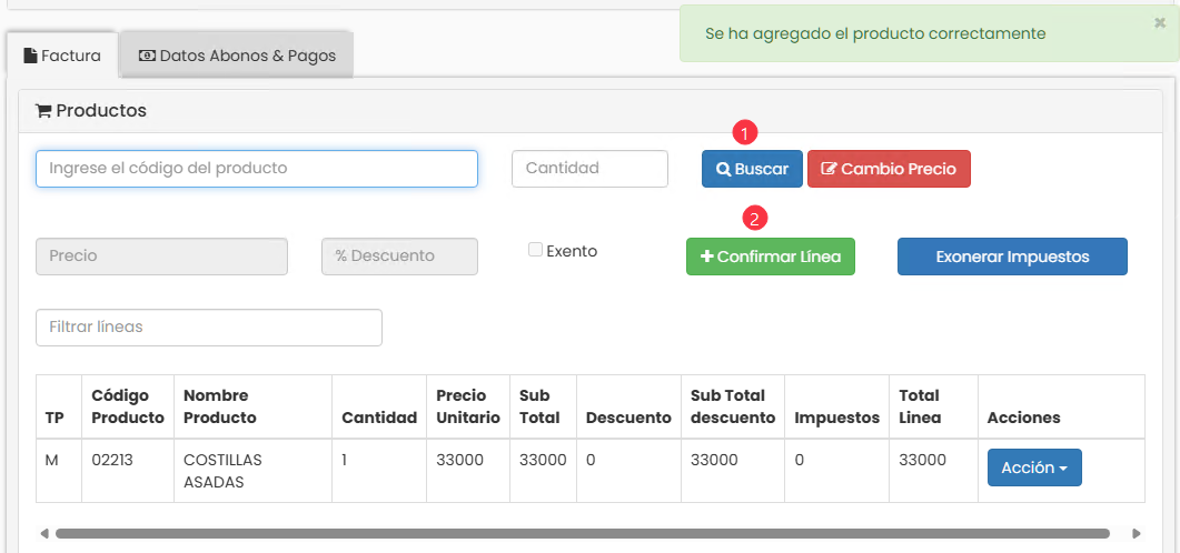 2 Una vez agregado el producto/servicio que desea modificar, dar clic en Confirmar Línea.