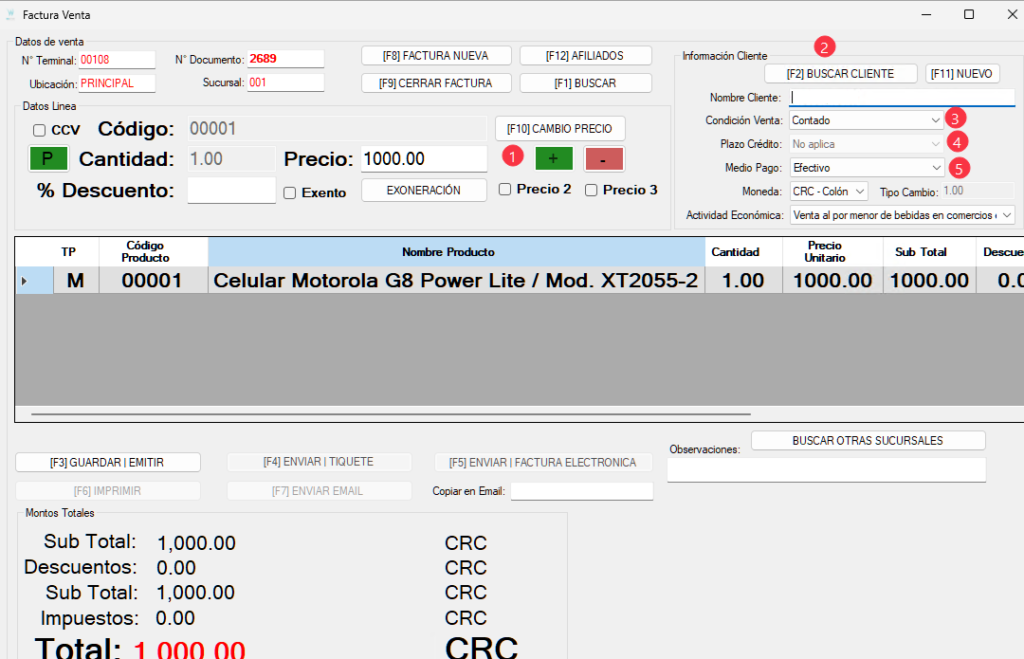 5. En “Medio pago” se selecciona la forma de pago (contado, tarjeta, cheque, etc.)