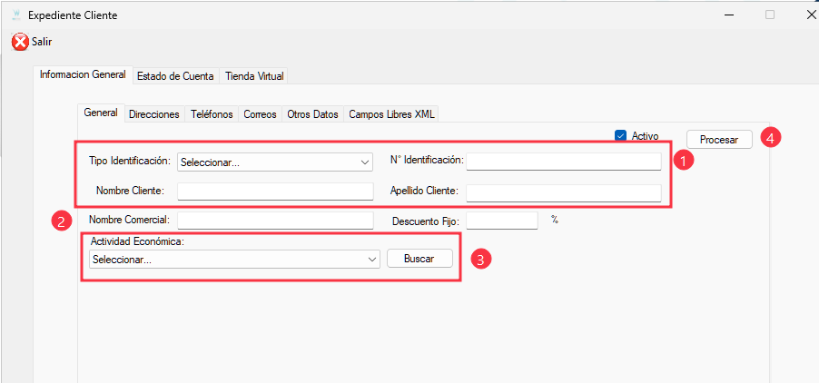 4. Después que se haya asignado la actividad económica, verificar que esté el check de “Activo”. Una vez que tenemos todos los datos de esta primera pantalla, presionaremos el botón “PROCESAR”, para que nuestro cliente se guarde.