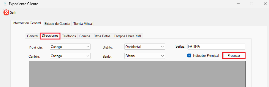 - Debemos de ingresar la provincia, cantón, distrito y barrio, así como las otras señas del cliente. (El campo de señas debe contener mínimo 5 caracteres para evitar rechazos por parte de Hacienda)
