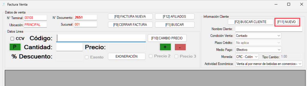 Estando en la pantalla de Factura de Venta, hacer clic en [F11] NUEVO en la esquina superior derecha.