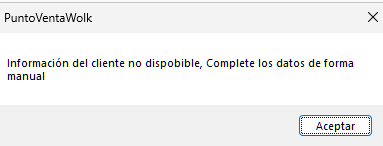 NOTA: En el caso de recibir el siguiente mensaje después de ingresar el número de identificación, debemos de ingresar nosotros los datos del cliente, ya que no se encontrarían en el registro de Hacienda.