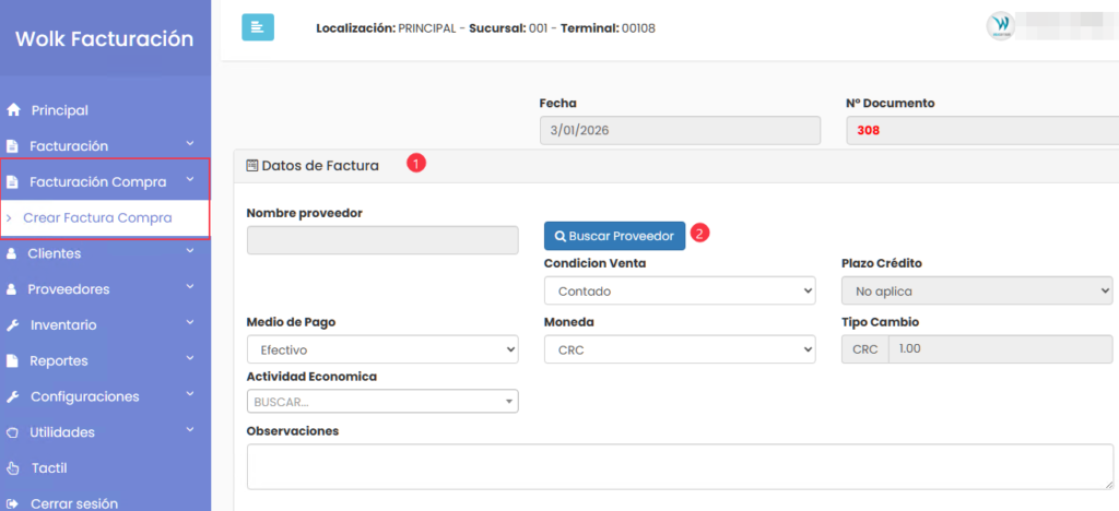 Para buscar, seleccionar y agregar un proveedor a una factura de compra, debemos seguir los siguientes pasos: