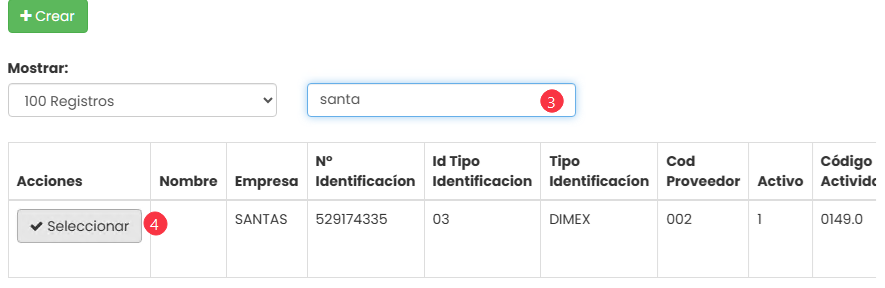 3 Luego se despliega una ventana, en donde podemos aplicar la búsqueda del PROVEEDOR requerido para el proceso, usando nombre o número de identificación.