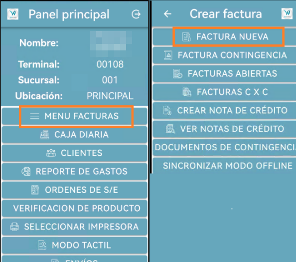 * En la ventana CREAR FACTURA, tocar la opción FACTURA NUEVA.