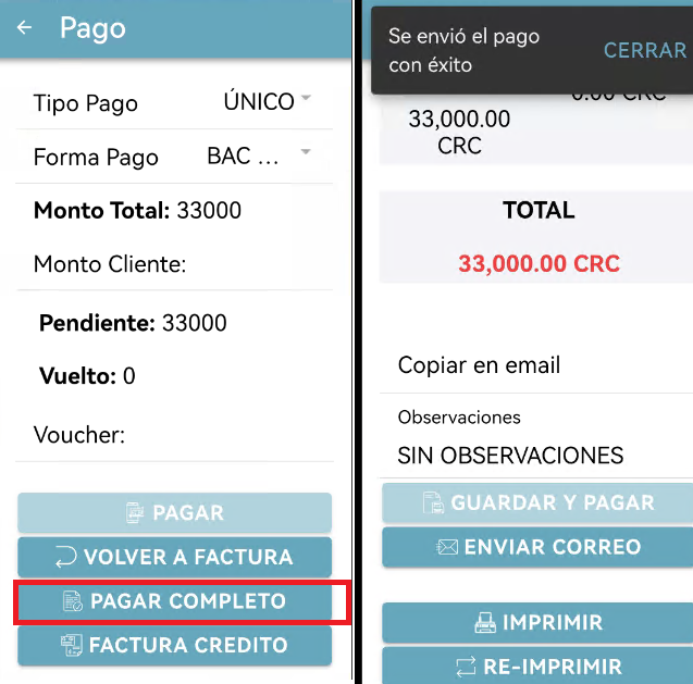 * Una vez se ha seleccionado la forma de pago, presiona el botón PAGAR COMPLETO.